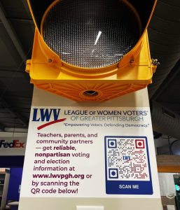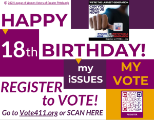 Beginning in 2019, the LWVPGH embarked on a program to support the voter registration procedures for eligible high school students in a five county area in western Pennsylvania. Through the creation and distribution of “Happy 18th Birthday” posters complete with a targeted QR Code for scanning, the LWVPGH reaches out to an estimated 20,000 senior high school students each year. (Photo below.) Upon scanning, students are routed to Rock the Vote, a national website that allows students to register for text or email reminders about their upcoming elections and then on to the Pennsylvania registration portal at Vote.pa.gov. Students with a PA driver’s license or a PA-ID can register online as their signature is already uploaded to the State. It is a quick and easy process.