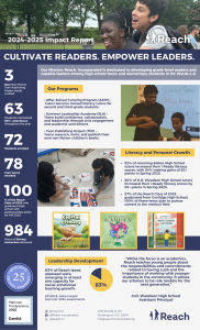 Reach Incorporated develops grade-level readers and capable leaders by training teens to teach younger students, resulting in improved literacy outcomes for both. Struggling teen readers benefit from practicing reading at, or just above, their current grade level. Younger readers benefit from targeted instruction and relevant texts. Through Reach’s unique, out-of-school-time model, the needs of both populations can be met through a single literacy-focused relationship.